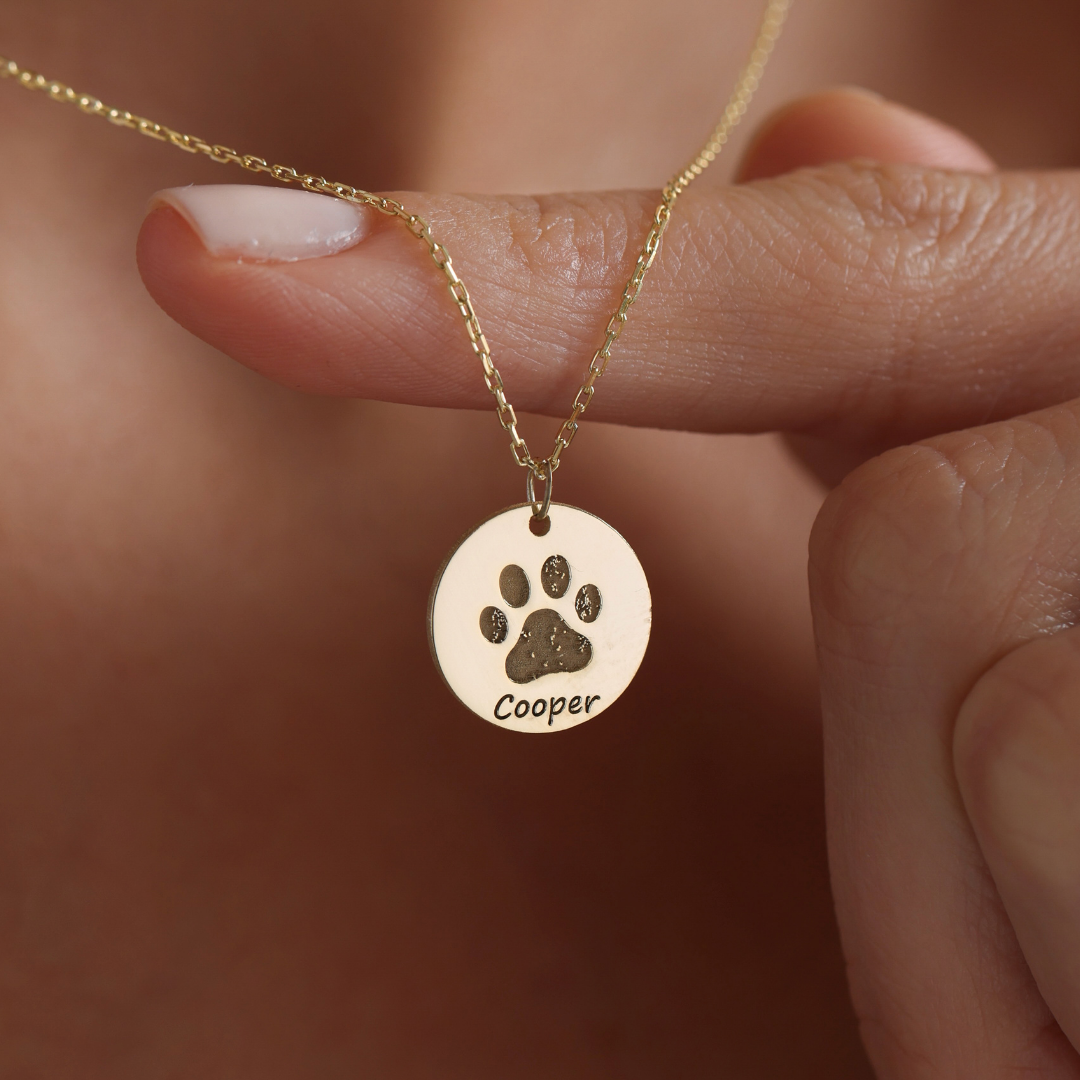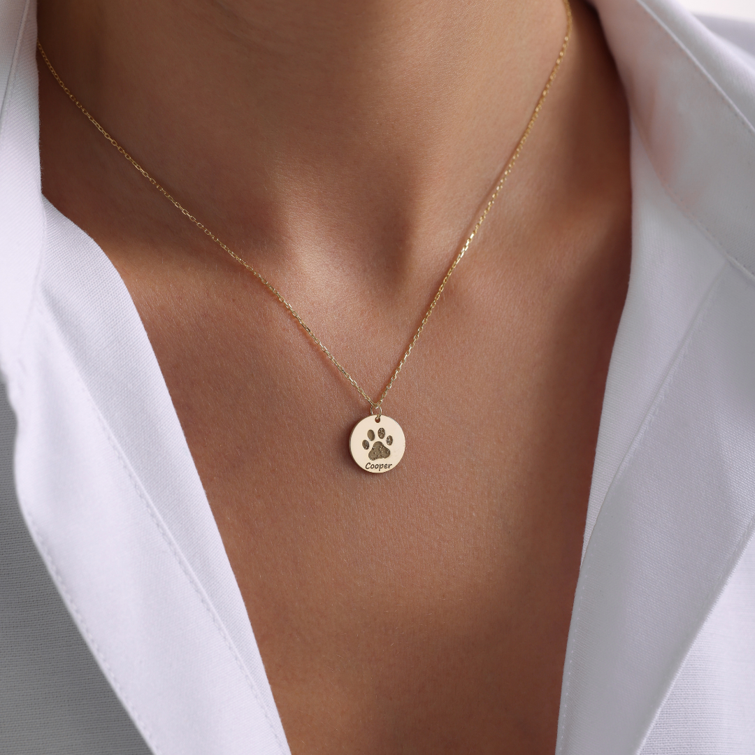 Show your love for your furry companion with our Custom Paw Print Necklace. This beautiful gold necklace features an engraved paw print and can be customized with your pet's name. Perfect for pet owners and animal lovers, it also makes a thoughtful memorial gift. Keep your pet close to your heart with this personalized necklace.
